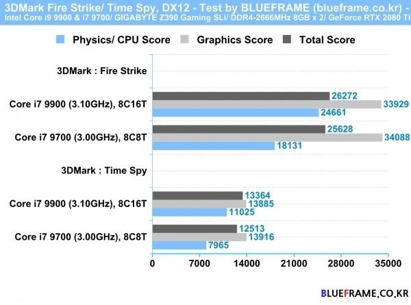 테스트에 사용한 코어 i7 9700과 코어 i9 9900은 8코어 8스레드와 8코어 16스레드, L3 캐쉬 12MB와 16MB, 기본 3.00GHz와 터보부스트 4.70GHz, 3.10GHz와 터보부스트 5.00GHz로 코어 i9 9900의 스펙이 유리하다. 그래픽카드의 기본 성능을 비교 가능한 3DMark Fire Strike와 Time Spy에서는 하이퍼스레딩을 지원하는 Physics/ CPU 스코어에서 코어 i9 9900K가 유리한 것으로 나타났고 전체 스코어에도 반영됐다.