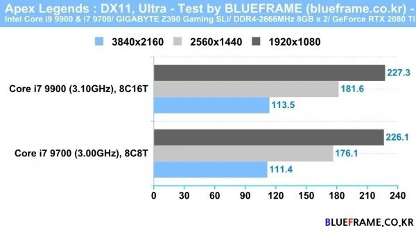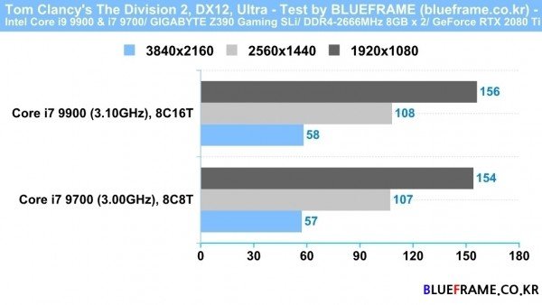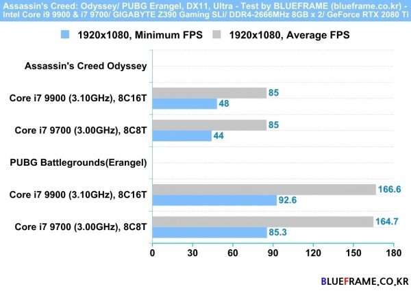 이번에는 실제 게임을 통해 코어 i7 9700과 코어 i9 9900 CPU 2종의 성능 향상을 살펴봤다. 멀티코어 CPU 지원 게임은 다양하게 등장하는 만큼 코어 및 스레드의 증가는 성능 향상으로 이어지는데 어쌔신크리드 오디세이(Assassin's Creed: Odyssey), 배틀그라운드(PUBG, Battlegrounds) 에이펙스 레전드(Apex Legends), 메트로 엑소더스(Metro : Exdus), 몬스터 헌터 월드(Monster Hunter World), 더 디비전 2(The Division 2)와 같은 오픈 월드 및 프레임(FSP)가 중요한 게임들에서 근소하지만 코어 i9 9900이 더 높은 클럭 지원과 하이퍼스레딩, L3 캐쉬 용량을 지원해 프레임이 향상됐다. 물론 레지던트 이블 RE 2(Resident Evil RE 2)와 같은 게임은 하이퍼스레딩을 미지원하는 코어 i7 9700이 유리하기도 했다.