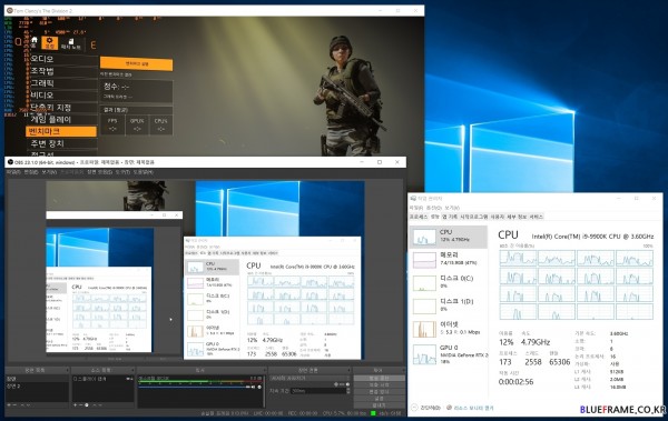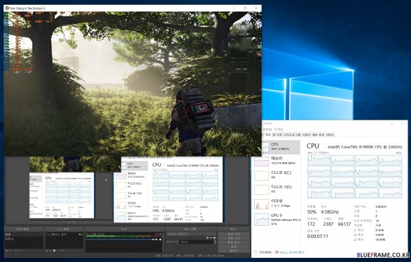 코어 i9 9900K 방송 끄기(상) 4% CPU 점유율 / 방송 켜기(하) 12% CPU 점유율