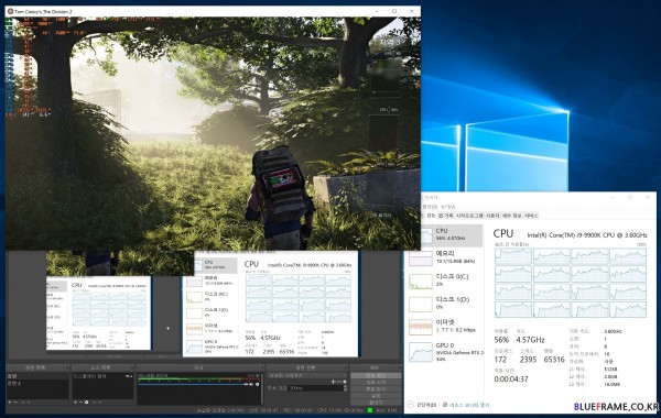 코어 i9 9900K 방송 끄기(상) 50% CPU 점유율/ 방송 켜기(하) 56% CPU 점유율