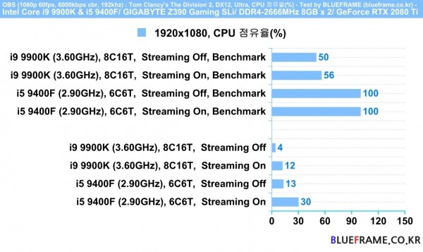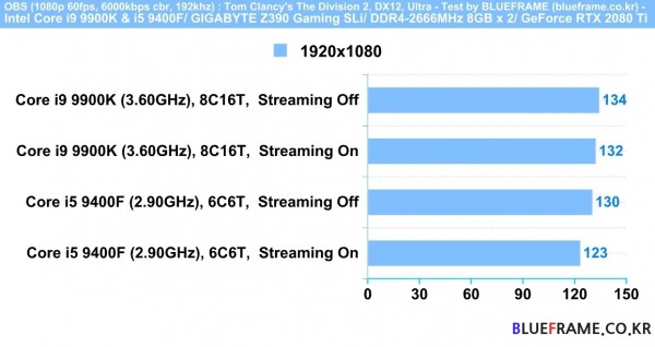 OBS와 같은 비디오 녹화 및 생방송 등 방송(스트리밍)을 진행하는 PC를 구성한다면 고사양을 요구하는 게임에서와 같이 더 많은 수의 코어와 스레드를 제공하는 멀티코어 CPU를 선택하는 것이 유리하다. 또한 퍼포먼스급 코어 i9 9900K는 2fps인데 반해 메인스트림급 코어 i5 9400F는 방송 끄고 켰을 때 7fps의 격차가 발생해 차이를 보였다.