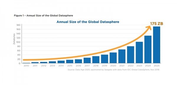 IDC에 따르면 글로벌 데이터량은 매년 증가하고 있으며 2018년 33 제타바이트(Zetabyte, ZB)에서 2025년이 되면 175 제타바이트에 이를 것으로 내다봤다. 1 제타바이트는 기가바이트(BG)로 환산하면 1조 1000억 기가바이트(GB), 엑사바이트로(EB)로 환산하면 1024엑사바이트(1EB = 1024PB)에 해당한다. 3MB 전후의 MP3를 281조 5000억 곡을 저장할 수 있을 만큼 엄청난 용량이다.