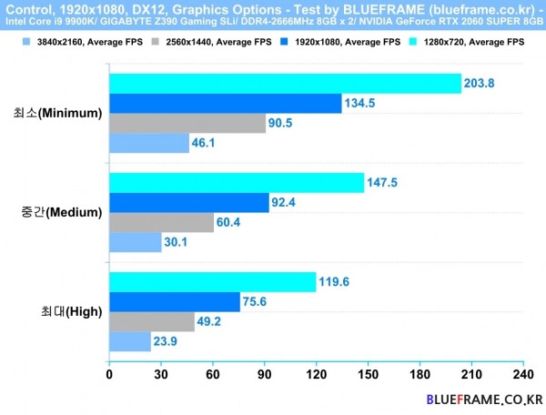 컨트롤 정식 버전을 기준으로 1920x1080 해상도에서 최대 그래픽 설정인 높음 (High, 편의상 그래프는 Ultra)을 적용한 결과 지포스 RTX 2060 SUPER 8GB과 AMD 라데온 RX 5700 XT 8GB 이상의 그래픽카드에서 60fps 이상의 플레이가 가능했다. 앞서 살펴본 것처럼 여기에 엔비디아 DLSS와 RTX 광원 효과를 모두 활성화한다면 프레임은 하락할 수밖에 없다. 결과적으로 CPU 사양과 함께 그래픽카드도 최고의 그래픽으로 플레이하기 위해서는 CPU와 그래픽카드를 위해 일정 수준 이상의 비용 투자가 필요해 보인다. 4K UHD 해상도 역시 하이엔드 지포스 RTX 2080 Ti 11GB로도 40fps 초반 정도로 고해상도에서 플레이하기는 쉽지 않아 보인다.