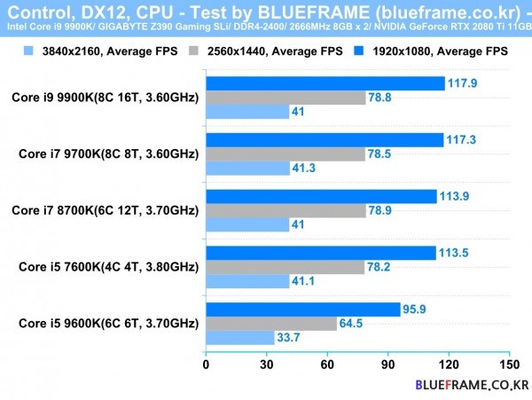 컨트롤은 초기 로딩 과정에서 대량의 데이터를 불러오고 본격적인 게임에 들어가면 데이터를 필요할 때마다 불러오는 것을 반복하며 게임이 진행되므로 그만큼 CPU 파워가 요구된다. 전반적인 게임 테스트에서는 권장 사양의 코어 i5 7600K 4코어 4스레드 CPU가 선전하고 있으며 이는 동작 클럭이 게임에 더 많은 영향을 주는 것으로 보인다. 6코어 6스레드의 코어 i5 9600K는 코어 i5 7600K보다 낮은 클럭으로 인한 것인지 더 많은 코어를 제공함에도 성능은 조금 낮게 측정됐다.