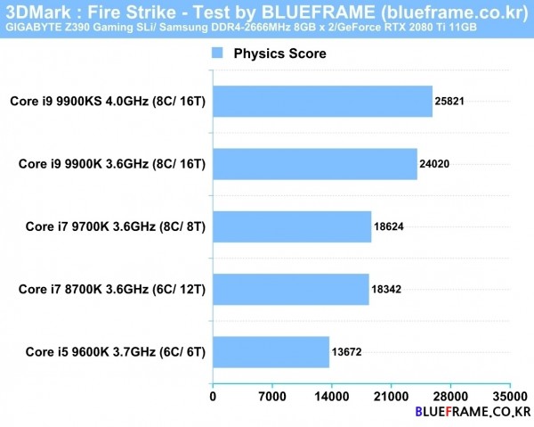 이번에는 그래픽카드의 성능을 살펴볼 수 있는 3DMark Fire Stire와 3DMark Time Spy(DX12) 테스트 중 프로세서의 연산 성능을 보여주는 Physics 스코어와 CPU 스코어를 통해 각 프로세서의 성능을 살펴봤다. 멀티 코어를 지원하는 소프트웨어 답게 더 많은 코어와 스레드를 제공하는 프로세서의 성능이 높게 측정되었으며 코어 i9 9900KS는 클럭 향상분 만큼의 성능의 향상으로 이어졌다.