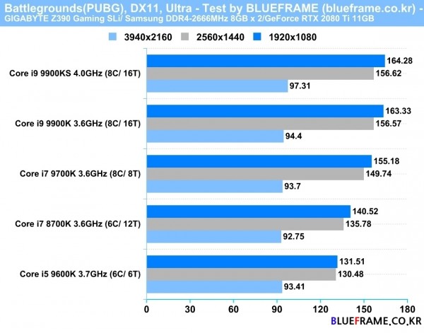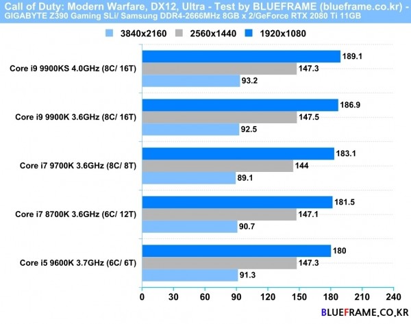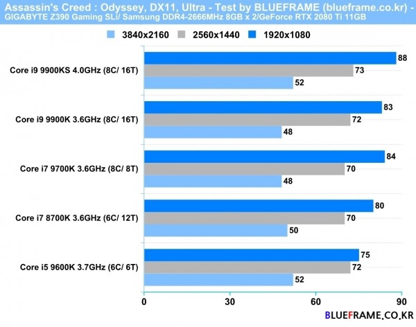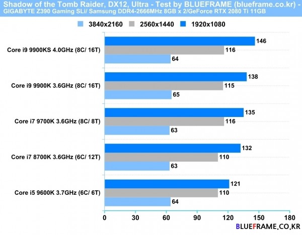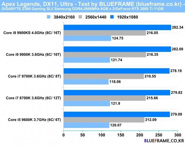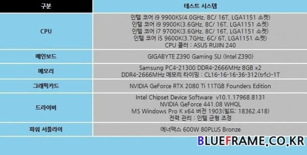 인텔 코어 i8 9900KS의 성능 테스트를 위해 코어 i9 9900K(8C/ 16T)와 코어 i7 9700K(8C/ 8T), 코어 i5 9600K(6C/ 6T) 프로세서, 삼성 PC4-21300 8GB 2개를 DDR4-2666MHz로 설정하고 게임 성능을 확인하기 위해 엔비디아(NVIDIA) 지포스 RTX 2080 Ti 11GB Founders Edition을 이용했다.