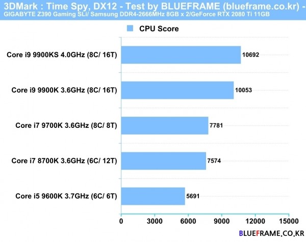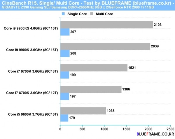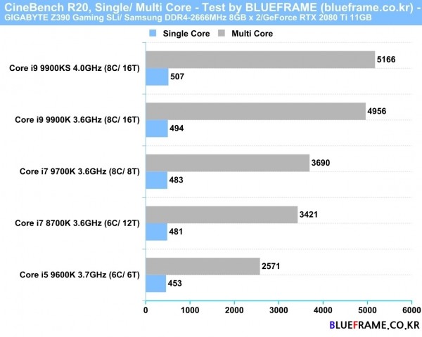 최근 멀티 코어와 멀티 스레드를 지원하는 소프트웨어 환경이 갖추어지면서 인텔도 메인스트림 9세대 코어 프로세서 라인업에서는 8코어를 도입했고 경쟁사도 더 많은 코어를 탑재해 CPU를 출시하고 있다. 멀티코어 활용도가 높은 시네벤치 R15(CineBench R15)와 시네벤치 R20(CineBench R20)에서 코어 i9 9900KS는 코어 i9 9900K와 동일한 8코어 16스레드(8C/ 16T)와 스펙을 제공하지만 올코어 5.0GHz 클럭 적용을 통해 한계치로 생각되었던 코어 i9 9900K를 앞서면서 향상이 이루어졌다.