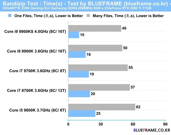 반디집(Bandzip)은 멀티 코어를 지원해 코어 수가 더 많은 프로세서의 성능이 유리하며 이번에도 동일한 코어와 스펙을 제공하지만 기본 4.0GHz 클럭과 올코어 부스트 클럭이 5.0GHz로 향상한 코어 i9 9900KS가 다시 한번 성능 향상이 이루어졌다. 인코딩 프로그램인 핸드브레이크(HandBrake)에서도 반디집과 같이 코어 i9 9900KS에서 근소하지만 빠른 처리가 가능한 것으로 나타났다.