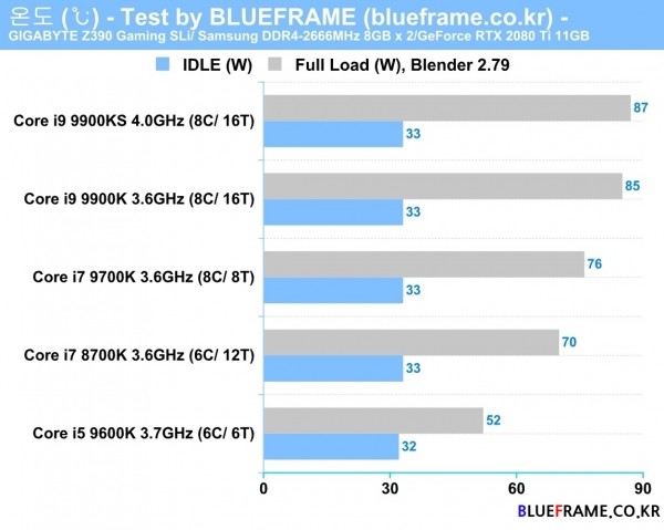또다른 렌더링 소프트웨어인 블렌더(Blender)도 멀티 코어와 멀티 스레드 활용이 잘되고 있어 더 많은 코어와 스레드를 적용한 프로세서의 성능이 유리한데 코어 i9 9900KS는 동일한 코어와 스펙에 더해 올코어 부스트 클럭이 5.0GHz로 향상되면서 렌더링 처리 시간도 개선됐다.