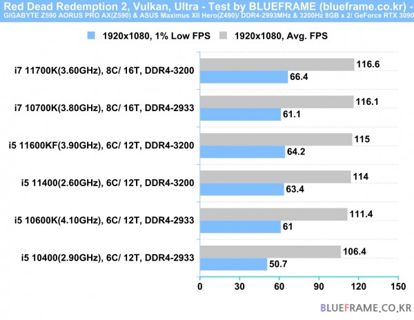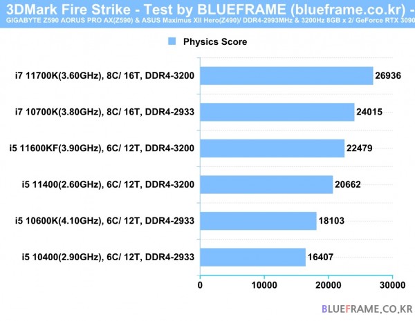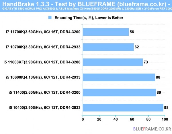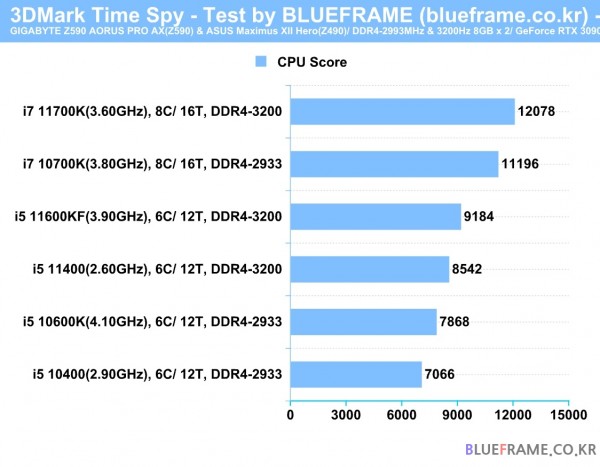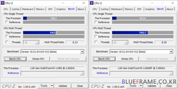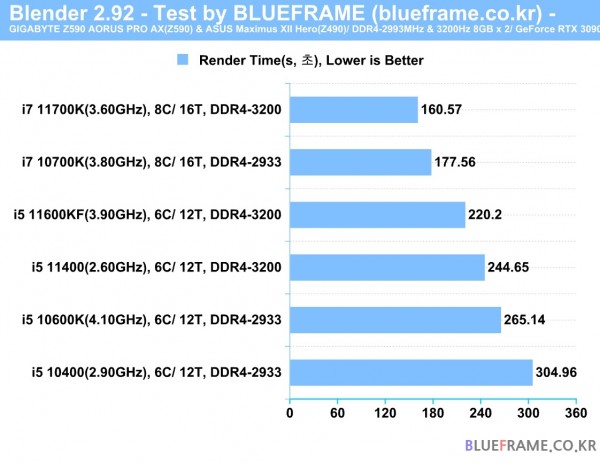 멀티 코어를 지원하는 벤치마크인 만큼 더 많은 코어와 스레드를 제공하면 성능이 우수한데 코어 i5 11400은 코어 i5 10600K와 동일한 6코어 12스레드를 제공하지만 11400은 개선된 아키텍처와 메모리 클럭 향상으로 이전 세대 코어 i5 10600K(KF) 이상의 성능을 제공할 것으로 예상된다.