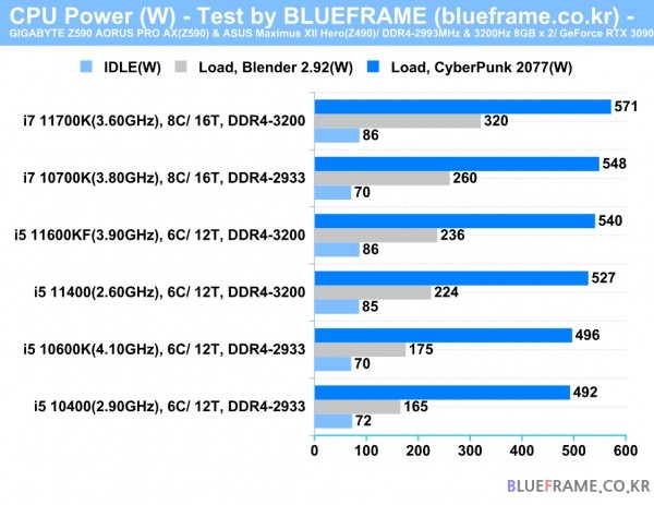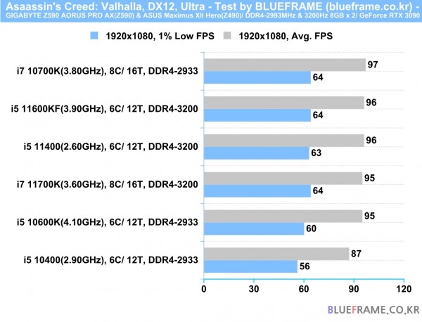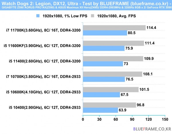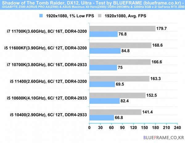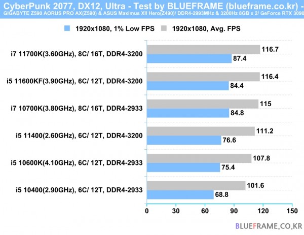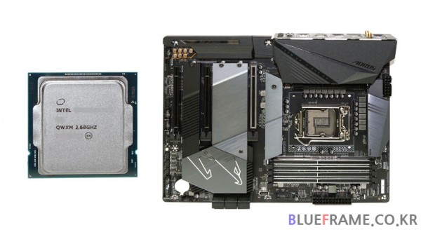 인텔 데스크탑용 11세대 코어 프로세서 테스트에는 코어 i5 11400(2.60GHz)와 코어 i5 10400(2.90GHz), 코어 i5 11600KF(K)(3.90GHz), 코어 i7 11700K(F)(3.6GHz), 코어 i7 10700KF(3.8GHz), 코어 i5 10600K(4.10GHz)의 6종 CPU를 이용했다. 메인보드는 GIGABYTE Z590 Aorus Pro Ax(Z590), ASUS Maximus XII Hero(Z490), G.SKILL Trident Z RGB PC4-27700 (DDR4-3466MHz) 8GB x 2, 메모리 클럭은 DDR4-2933/ 3200MHz(CL16-18-18-38-347-1T), 그래픽카드는 엔비디아(NVIDIA) 지포스 RTX 3090 FE(Founders Edition) 24GB, ASUS Thor 850W Platinum, 쿨러는 ASUS ROG Strix 360 LC RGB 일체형 수냉 쿨러, Intel 칩셋 드라이버 v10.1.18295.8201, 지포스 게임 레디(GeForce Game Ready) 461.92WHQL 드라이버, MS 윈도우 10 Pro K 64bit 20H2(빌드 19042.868)를 이용했다.