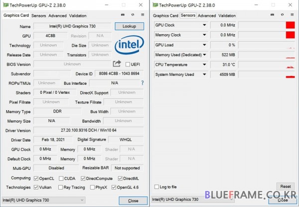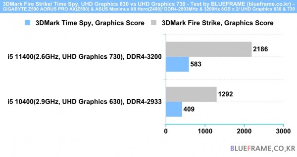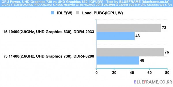 인텔 11세대 코어 프로세서 코어 i5 11400의 인텔 UHD 그래픽스 730과 10세대 코어 프로세서 10400의 인텔 UHD 그래픽스 630은 세대와 아키텍처 차이를 통해 인텔 UHD 그래픽스 730의 성능은 향상되었지만 전력 소모량은 크게 증가하지 않은 것으로 나타났다.