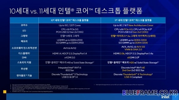 소프트웨어 명령어 셋은 AVX와 AVX2의 지원과 AVX 512 추가, 인공지능(AI) 가속을 위한 VNNI & GNA 2.0으로 인공지능 처리를 위한 환경을 향상한다. 코어 i3 라인업까지 하이퍼스레딩(Hyper-Threading) 확장, LGA 1200 소켓으로 기존 400 시리즈 메인보드에서 지원이 가능하지만 PCI-Express 4.0(PCIe 4.0)과 DDR4-3200MHz 클럭으로 시스템 성능 향상, PCIe 레인은 11세대가 CPU PCIe 4.0 x16과 CPU x4 PCIe 4.0, PCH USB 3.2 지원은 10세대가 USB 3.2 Gen 2x1(10G)에서 USB 3.2 Gen 2x2(20G)를 지원한다. 디스플레이 지원도 10세대는 HDMI 1.4와 HDCP 2.3, DisplayPort 1.4에서 11세대는 HDMI 2.0b와 HDCP 2.3, DisplayPort 1.4a를 지원하며 CPU와 PCH의 데이터 연결 통로인 DMI는 기존 DMI 3.0 x4에서 11세대는 DMI 3.0 x8로 2배 향상돼 빠른 데이터 처리가 가능해졌다.