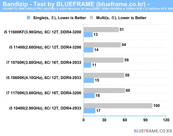 반디집(Bandzip)은 멀티 코어를 지원해 코어 수가 더 많은 프로세서의 성능이 유리한데 코어 i5 11400은 더 많은 코어를 가진 코어 i7 11700K(KF) 대비 빠른 처리 성능을 보였으며 인코딩 프로그램인 핸드브레이크(HandBrake)에서는 코어와 스레드 수 차이에 따라 성능 차이를 보여 차이를 보인다. 개선된 아키텍처를 기반으로 IPC 19% 향상과 DDR4-3200MHz로 향상된 메모리 클럭 적용에 따라 멀티미디어 및 스트리밍, 영상 편집이나 렌더링 등 다양한 환경에서 개선된 성능을 기대할 수 있을 것으로 예상된다.