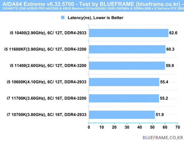 인텔 코어 i5 11400는 새로운 사이프레스 코브 아키텍처를 통해 연산 유닛 증가와 데이터 저장 공간 확장이 이루어졌으며 증가한 L1/ L2 캐쉬를 비롯하여 DDR4-3200MHz로 메모리 클럭이 개선됐다. AIDA64 Extreme의 메모리 벤치마크 성능을 보면 메모리 클럭이 DDR4-3200MHz로 증가해 기존 세대 대비 향상된 메모리 읽기와 쓰기, 복사 성능이 개선되었으나 레이턴시(Latency)는 기존 10세대 대비 느려졌다. 11400은 기존 코어 i7 10700K/ i5 10600K 대비 메모리 읽기와 쓰기, 복사 시간은 앞섰으나 레이턴시는 느렸으며 10400보다 앞섰다. 11세대 코어 프로세서는 전반적으로 메모리 클럭으로 느려진 레이턴시를 보완하며 H570/ B560 칩셋 메인보드에서 메모리 오버클럭을 지원하는 만큼 보급형과 메인스트림 라인업에서 이를 이용해 시스템 성능을 개선할 수 있을 것으로 예상된다.